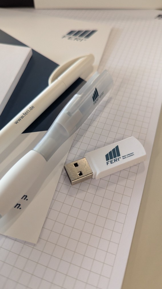 Am Montag, den 23. März 2026 spendete Frau Drögemüller der FERI AG Schreibblöcke, Notizblöcke, Stifte und Kombikugelschreiber mit USB Sticks um nach einem Logo Update nicht mehr benötigtes Büromaterial sinnvoll zu verwenden.
